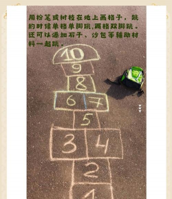 找个平坦地面,用粉笔画格子,或者用胶带贴,家里地板也行,画个飞机形状,格子从1到10,单格双脚跳,双格分脚跳,最后画个半圆,当作天空,也就是终点。