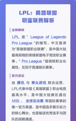 lpl是一个职业化联赛,有十几支固定战队,每年分春季赛和夏季赛,战队之间互相比赛,争夺积分和排名,成绩好的队伍,能晋级全球总决赛,和全世界强队较量,争夺最高荣誉,联赛有完整的赛程,专业的解说,和大量的观众。