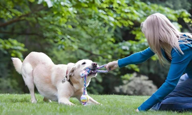 拔河也是狗狗很爱的游戏,你可以用一根结实的绳子,然后,跟它进行友好的拉扯,不过,要注意安全,别让它咬到你的手,这个游戏能锻炼它的咬合力,同时,也能增进你们之间的信任,当然,玩的时候要适度。