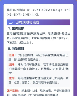 再看基本出牌规则出牌时,要按顺时针方向,一家一家地出,你可以出单张,也可以出对子,或者出顺子,但牌必须比上一家的大,才能压住,如果你不想出,或者出不了,那就只能“过”,让下一家继续出,直到一圈人都“过”了,这一轮才算结束。