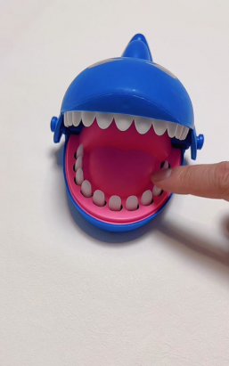 玩法其实很直接,大家轮流,按鲨鱼的牙齿,每次按一颗,谁按的时候,鲨鱼嘴巴突然合上,谁就输了,游戏就结束了,听起来有点,刺激对不对,但其实很安全,不会伤到手。