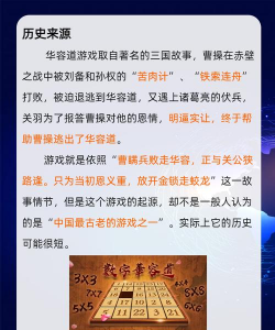 华容道的故事,其实来自三国演义,曹操在赤壁战败后,逃到华容道,关羽念旧情,放走了他,游戏就借用了这个典故,棋盘上的大块代表曹操,其他小块是关羽和张飞等将领,你的任务就是帮曹操突围,这游戏流传了很久,深受大家喜爱。