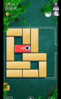 中间有几块石头挡路,它们不能移动,所以我们要利用可移动的木板,在它们周围搭桥,特别注意那块横着的短木板,把它移到石头右边,就能连接出一条通道。