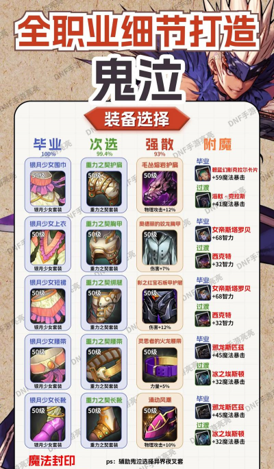 装备是提升战力的关键,对于鬼泣来说,首选增加智力,和暗属性强化的装备,武器方面,太刀是不错的选择,攻速快,手感好,防具可以选布甲套装,能大幅提升技能伤害,首饰也要注意,尽量选择,带有暗属性附加伤害的。