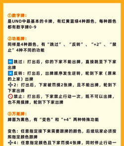 功能牌是关键uno里有几种功能牌,它们让游戏变得有趣,跳过牌,可以让下家失去本轮出牌机会,反转牌,可以改变出牌顺序,比如顺时针变逆时针,加2牌,让下家摸两张牌,并且跳过出牌,万能牌和加4牌,可以无视颜色打出,并且指定下一个颜色。