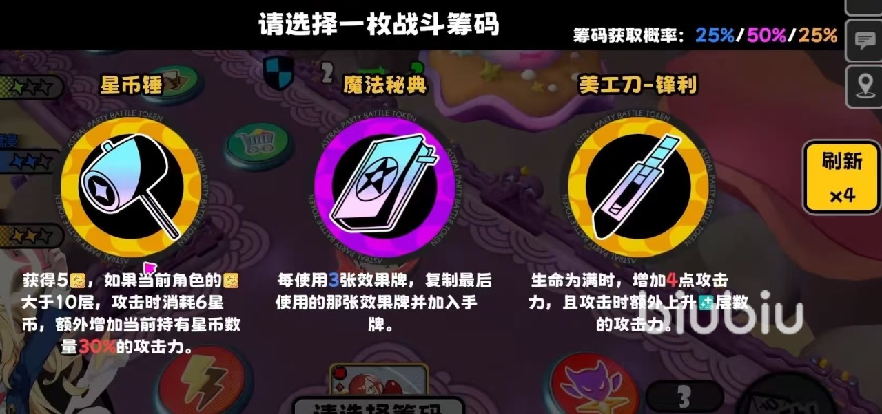 要想获得筹码,主要分为三个渠道。第一个是筹码商店,这也是最可控的一类,踩地图上的商店格子,每次就可以刷新出3~5个,消耗星币也可以进行刷新,单局获取有上限,优先选择符合当前流派核心的筹码。也可以通过怪物掉落的方式,无论是精英怪还是boss,在击杀之后都有几率掉落,但是品质不同,在高星区域更容易出现紫或者是金品质。完成筹码奖励可选任务时也可以获得,能在接取前预览品质和类型。