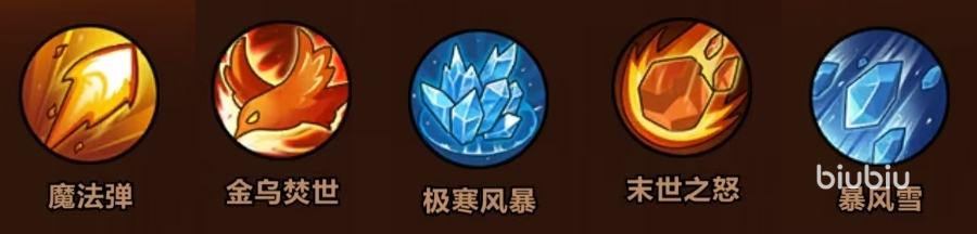 技能选择:魔法弹+金乌焚世+极寒风暴+末世之怒+暴风雪