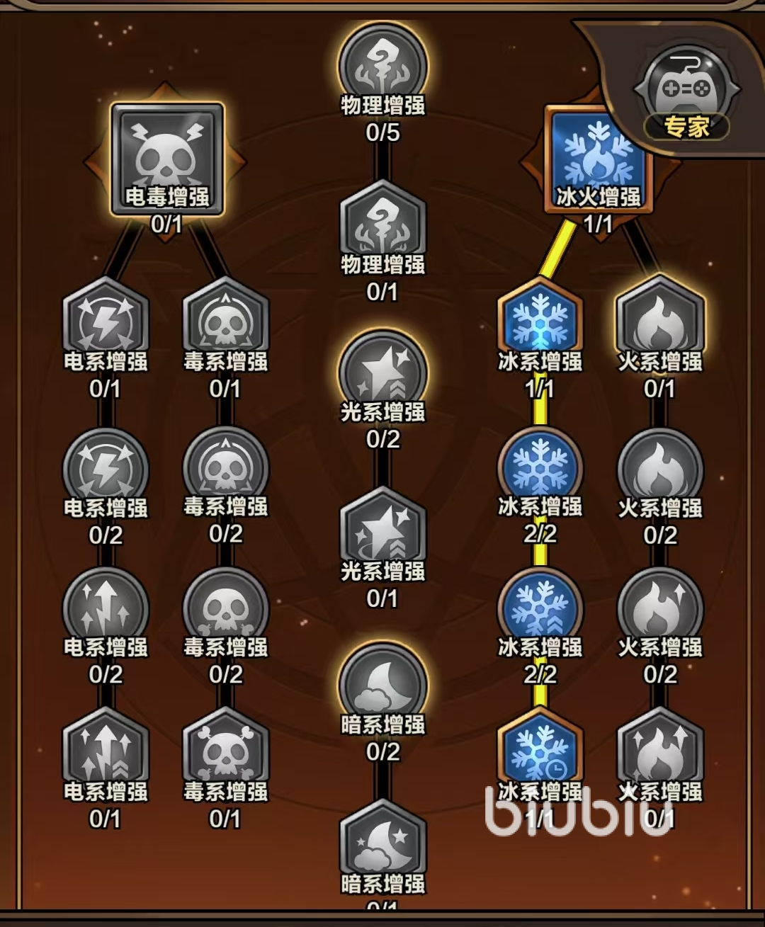 【元素专精】中大多为伤害天赋,玩家可像【进阶天赋】那样,根据自己所使用的技能元素类型来激活对应元素的增强天赋。若玩家走的光系、暗系或魔法弹系,那么只需点满中间一列即可。剩余天赋点可自由选择想点的天赋。