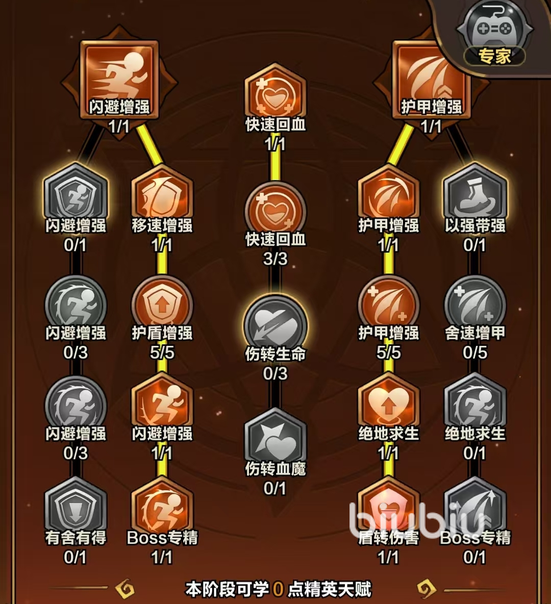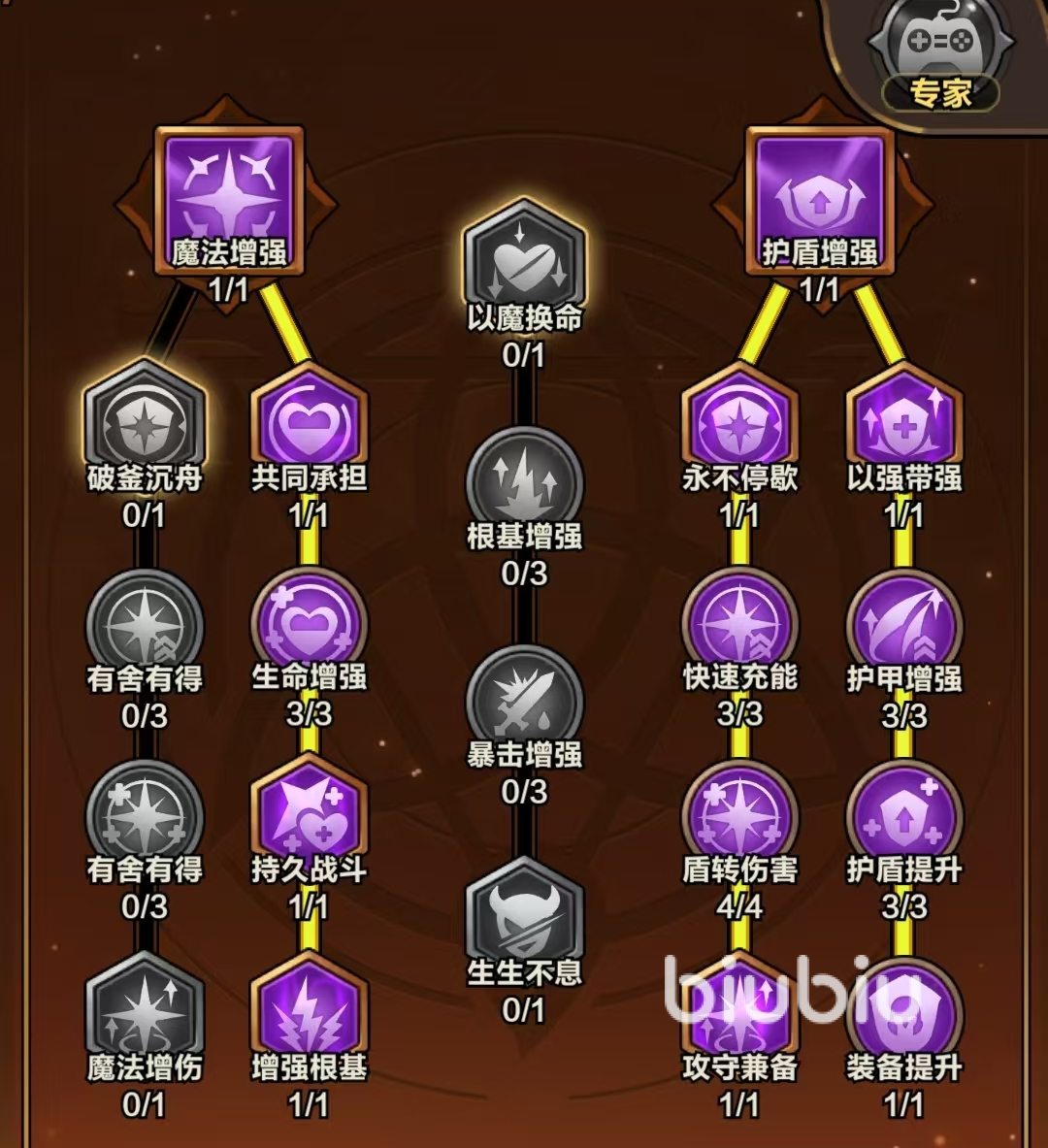 需点出【护甲增强】系中的【盾转伤害】,以及【闪避增强】系的【Boss专精】,可大幅提高玩家在护盾庇佑下的输出。中间一行的【快速回血】必点,它能抵消【魔法天赋】中【共同承担】带来的负面效果。