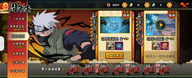 抽高招要选对时间,新忍者上架时,概率会有小幅提升,这是官方公布的,不是玄学,所以尽量在新S忍或A忍首发时,集中资源去抽,另外,高招返场时,也可以考虑入手,但优先级不如首发,平时攒好金币,别乱花,等到时机成熟再出手。