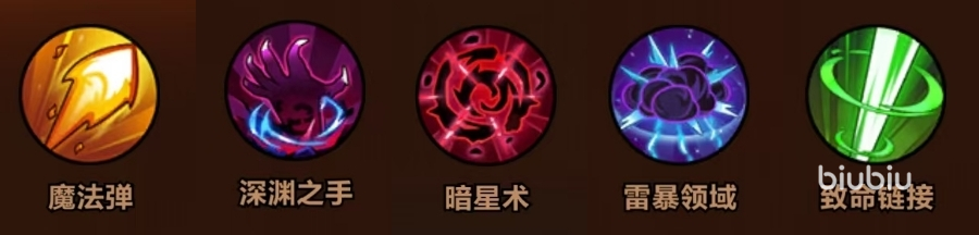 技能选择:魔法弹+深渊之手+暗星术+雷暴领域+致命链接