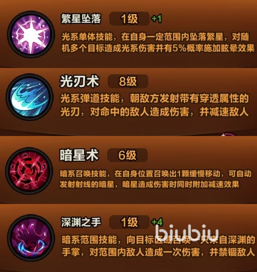 注:搭建本流派需拥有【光刃术】、【繁星坠落】,且它们的等级至少要达到2级,若能达到14级则更好。