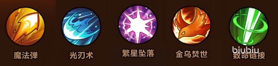 技能选择:魔法弹+光刃术+繁星坠落+金乌焚世+致命链接