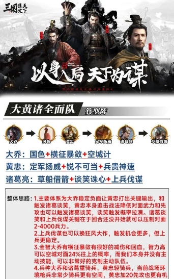 先看兵种搭配游戏里有不同兵种,比如步兵,骑兵,弓兵,它们互相克制,步兵克弓兵,弓兵克骑兵,骑兵又克步兵,所以,布阵时,要考虑对手阵容,灵活调整自己的部队,才能取得优势。