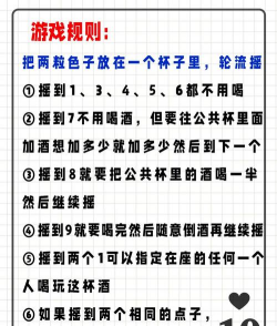 游戏开始前,大家先坐好,围成一圈,然后轮流掷骰子,点数最大的人,可以先开始,他需要选一个格子,完成里面的任务,如果成功完成了,就可以指定一个人,喝一小杯酒,如果没完成,或者不想做,那不好意思,自己就得喝一杯,然后,轮到下一个人,继续选格子做任务,就这样一直循环。