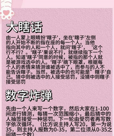 室内还是室外,人多还是人少,这很关键,比如室内空间小,就别选跑动大的,人少的话,团队对抗就不太合适,所以,第一步是看清条件,再去找游戏。