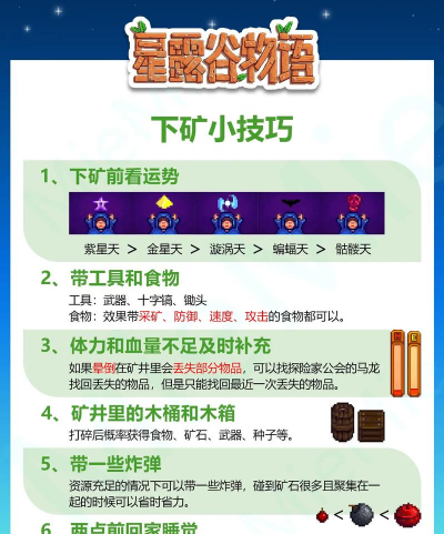 刚开始玩,钱和工具都很差,所以别乱花,第一笔钱,建议买把好镐子,镐子越好,挖矿速度越快,效率就上来了,然后注意体力值,挖矿会消耗体力,体力没了就得休息,或者吃食物补充。