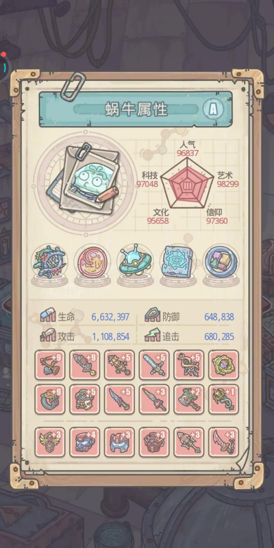 然后说蜗牛怎么培养蜗牛有五个形态可以进化,每个形态都有不同能力,前期建议先升攻击和生命,这样推图会轻松很多,基因研究很重要,能大幅提升属性,记得优先点满,装备也要跟上,好的装备加成很可观。