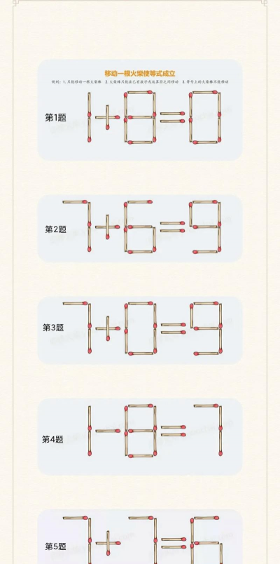 第一种是摆算式,让你移动一根,使等式成立,这种题最多,解题时,先看两边大小,如果左边太大,就想想,能不能让左边变小,或者,让右边变大,移动一根火柴,数字变化有限,所以,思路要灵活,第二种是摆图形,移动指定数量,变成新图形,这种题,考验观察力,要想象移动后,图形的样子。