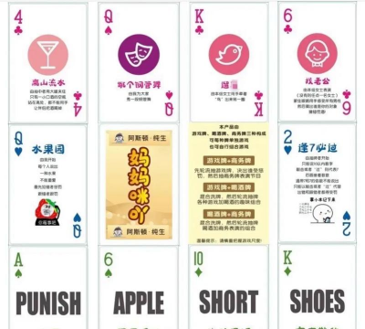 最常见的玩法是抽牌,每人轮流从牌堆抽一张,根据牌面执行动作,比如抽到A,可以指定一个人喝,抽到2,就是“小姐牌”,别人喝酒你要陪,抽到3,自己喝一口,抽到4,摸鼻子,最后一个摸的人喝,这些规则可以自定义,玩之前统一就行。