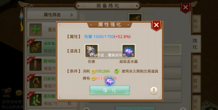 强化需要黑水晶,还有超级黑水晶,这些材料哪里来,日常任务会给,比如除暴任务,还有修行任务,也能得到,副本挑战也不错,比如兰若寺,或者黑风洞,都能掉落材料,集市也能买,但价格不便宜,所以多刷任务,才是好办法。