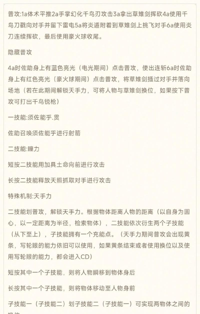 最后看奥义释放时机佐助的奥义,伤害很高,但释放时机要选好,最好在对手没有替身时用,或者用连招把对手打到墙角,再接奥义,这样基本能打满伤害,另外,奥义也可以用来躲技能,比如对手放了大招,你算好时间开奥义,能无敌躲过,反打一套,不过,奥义冷却长,别随便乱放,留着关键时候用。