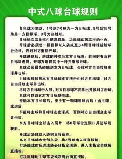 最后是黑8的击打规则打完自己的球后,就要打黑8了,这是决胜时刻,规则也更严格,击打黑8前,你必须明确指定目标袋口,就是说,你要告诉对手,准备把黑8打进哪个袋,然后,你必须合法地把它打进指定的袋,才算胜利,如果在打黑8时犯规,比如白球落袋,或者黑8飞出台面,你就直接输掉这局,所以,打黑8要特别稳,看准了再出杆。