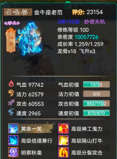 作为高级召唤兽,它的成长率不错,攻击资质也很高,这意味着,它在后期培养起来后,基础伤害会很可观,当然,它的防御和血量,相对会薄弱一些,所以,在实战中需要保护,或者搭配一些生存技能,避免被对手集火秒掉。
