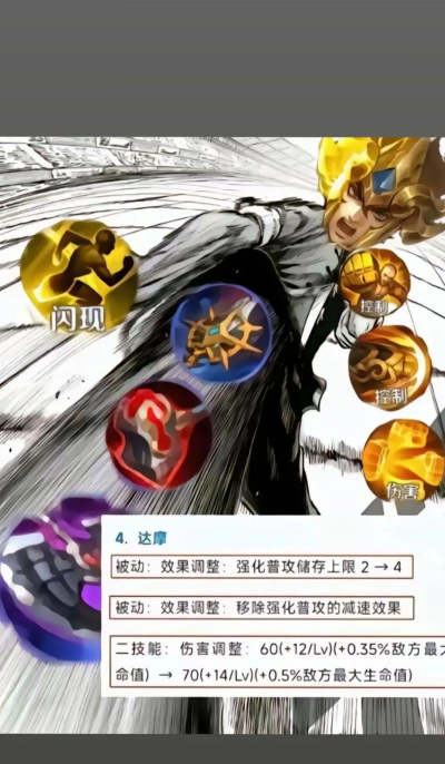 接着是打法思路前期要稳,达摩四级前不强,尽量在塔下发育,等到了四级,有了大招,就可以找机会了,多去边路支援,利用地形,把敌人踢到墙上,配合队友完成击杀,中期要带节奏,多参团,找好进场时机,别第一个冲进去,等对方交掉关键技能,你再进场,效果会更好。