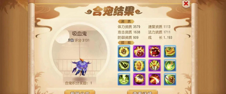 再看技能搭配技能怎么放,也有讲究,主宠的技能,最好先垫书,把垃圾技能,用便宜兽诀顶掉,副宠的技能,也要挑一挑,尽量保留有用的,比如必杀、连击,这样合成后,新宠物技能多,而且质量高,实战会更猛。
