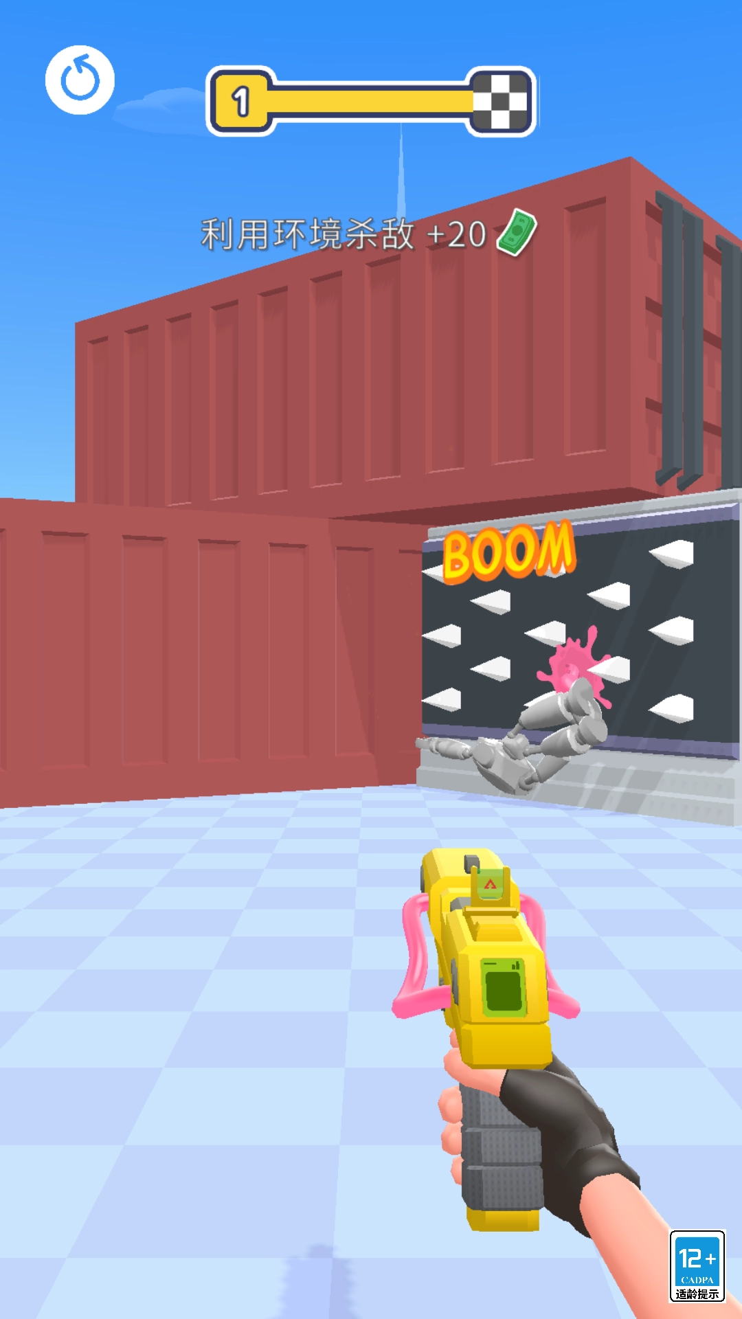 2、每个关卡都配备了不同的环境陷阱和机器人部队,需要灵活移动,同时借助场景中的道具来制造连锁爆炸效果。