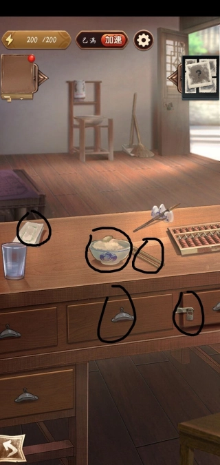 2、点击桌面下方的锁,能获取抽屉上的锁以及中间抽屉里的一叠汇票;在桌面上还可以拿到借据、一双竹筷和一碗白饭。
