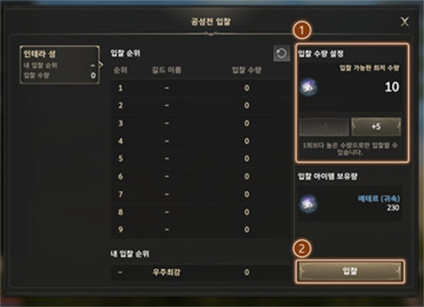 -您可以依据捐赠的'ether'排名,让每个服务器排名第9位的公会参与围攻(Suseong公会无需竞价,自动参与)。