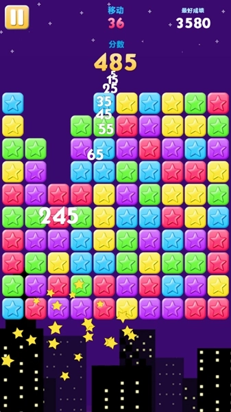 消消乐开怀以城市夜色为背景,结合经典的消除玩法,能带来一定的沉浸感。游戏中有多种颜色的星星,玩家需要把相同颜色的星星匹配起来,只要数量超过三颗就能消除。而且一次性匹配的星星越多,得分就越高。消除后产生的空隙会自动填补,若填补后还能触发消除,就能获得连击积分。