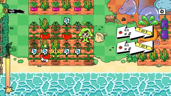 游戏的画风既搞怪又透着几分可爱,色彩搭配十分鲜亮夺目。在基础的种田浇水玩法之外,还得合理规划农作物的种植布局,才能触发最高的Combo效果。不同农作物对应的连击区域各不相同——像玉米是横向的连击范围,番茄则是纵向的;等连击数累积到顶峰时,就会解锁超级丰收技能,让所有农作物瞬间成熟。这个设计确实挺有新意的。