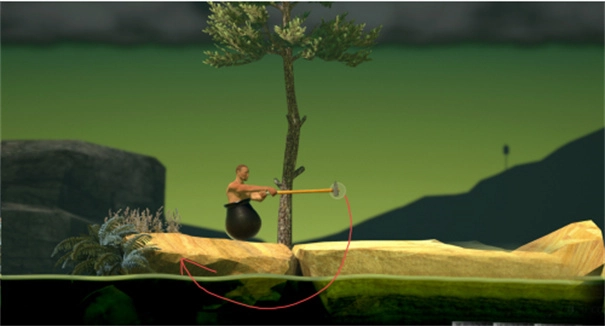 这个玩法相当有趣,玩家用锄头向下推,借助反作用力就能让自己向上移动。
