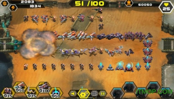 通过触控屏幕进行操作,打造出多个机器人,设置通道上的障碍,在敌人行至道路的另一条通道时将他们消灭……