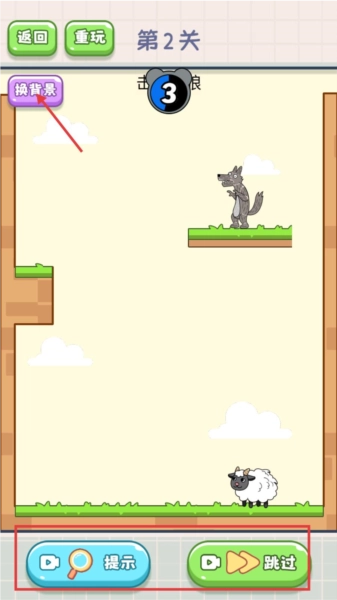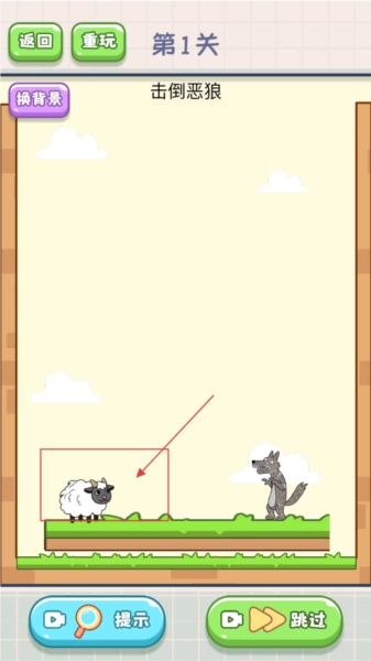 1、游戏开始后,玩家需通过滑动屏幕来操控小羊瞄准并消灭恶狼。