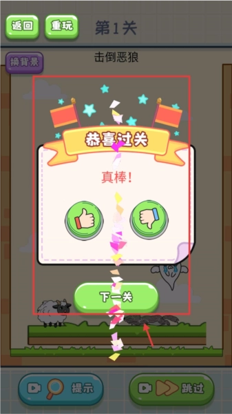 3、当玩家成功消灭恶狼后,即可通过本关卡,并获得本关卡的评分。