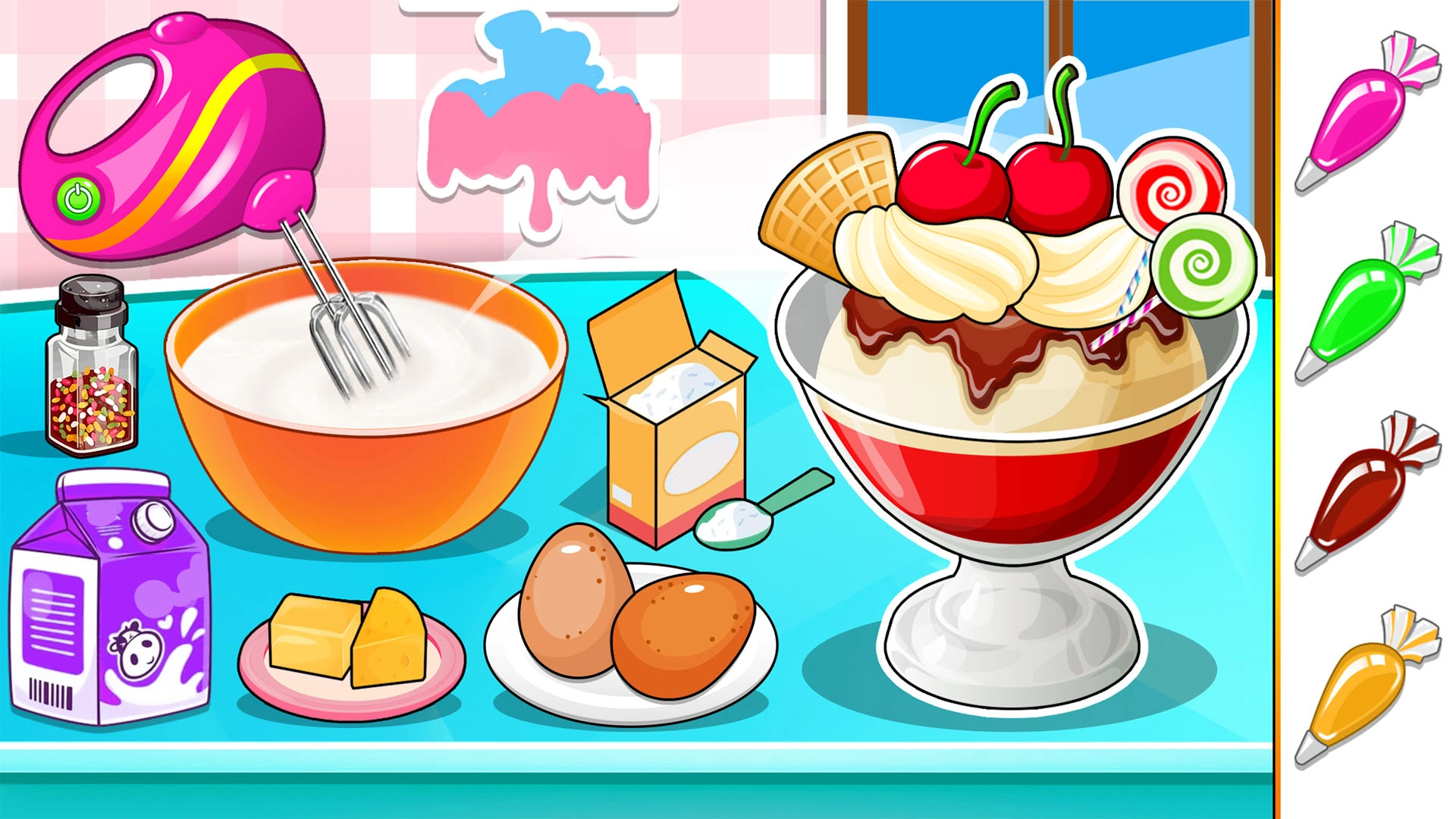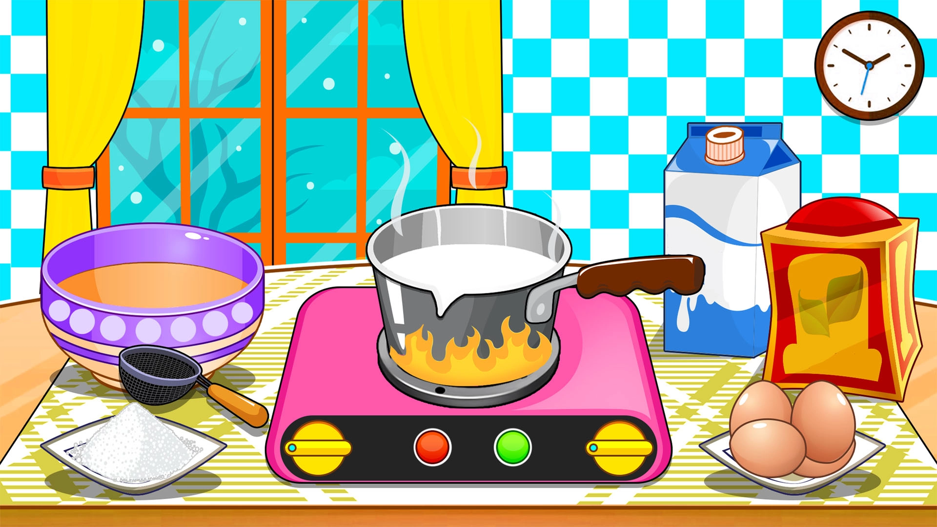 2、点击并拖动鸡蛋、牛奶等食材,使用搅拌机、炉灶等厨具,按照流程进行搅拌、蒸煮等加工操作。