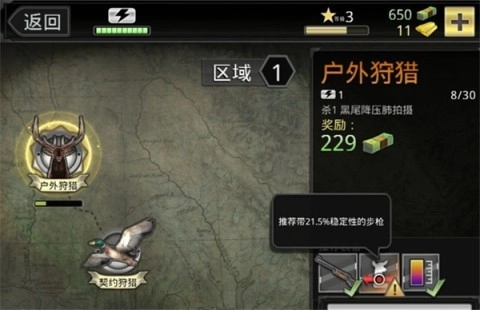 准备工作完成后,就可以开启狩猎行动了,第一步要确认任务的具体要求。像下面这个任务,要求是【猎杀1只黑尾降压并拍摄其肺部】,意思就是得捕猎一只叫黑尾降压的动物,借助红外线瞄准装置命中它的肺部。任务提示里推荐使用杀伤力超过84、稳定性达到21.5%及以上,并且具备红外线功能的步枪。不过这只是建议,要是对自身的射击精准度有把握,也可以不用依靠红外线。