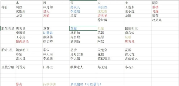 下面是当前对侠客的统计情况,图中仅标注了输出类型的侠客,辅助和肉盾类侠客暂时未做标注,相关内容将在后续进行说明。