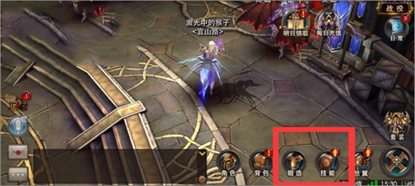 屏幕右下角的功能菜单包含锻造和技能两个选项。锻造菜单用于提升角色的外在装备,技能菜单则是对角色当前使用的技能进行升级。需要注意的是,技能的等级不能超过角色的等级。例如,若图片中角色等级为30级,那么其技能等级最高也只能达到30级。