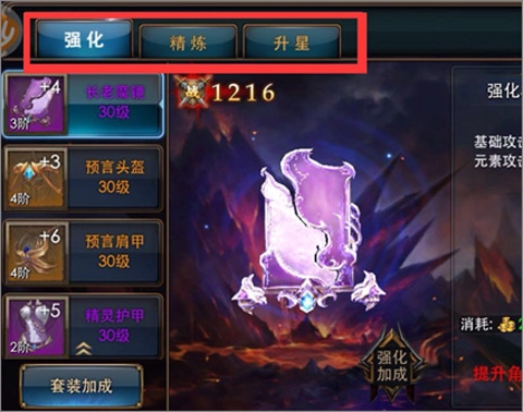 点击锻造菜单后,可对装备执行强化、精炼与升星这三种操作。其中,精炼和升星需使用对应的材料,这些材料可通过攻击Boss获取。