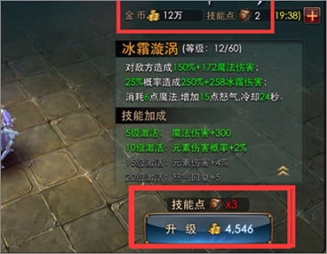 点击技能菜单后,消耗金币与技能点来提升技能等级。技能等级越高,所需的技能点和金币就越多。当技能点不足时,可使用钻石购买,不过每天的购买次数是有限制的。