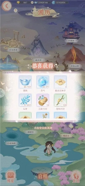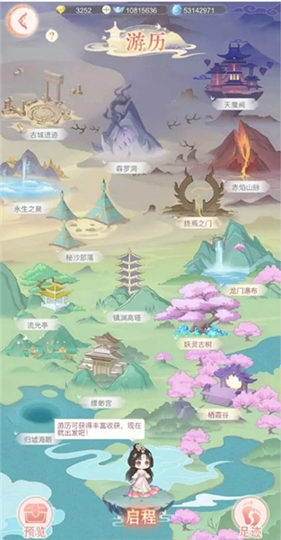 仙主大人们只需通关1-9的剧情关卡,就能解锁游历玩法啦。进入【仙门】界面后点击“游历”,就能看到所有可前往的游历地点,而且随着主线剧情的推进,还会陆续解锁新的游历地图哦。在游历界面点击“启程”,系统会随机匹配已解锁的地点开启游历,单次游历最长可进行8小时。仙主大人们可以通过“足迹”功能查看已经收集到的材料。不同的游历地点产出的资源各有不同,包括银两、灵气、仙草,还有一定概率获得各类珍稀物品。需要注意的是,每个地点的游历时间满10分钟才能100%拿到必得奖励,要是没到10分钟就结束游历,可是无法获得奖励的哟。