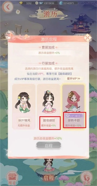 仙主大人选好游历行装后,就能开启游历之旅啦。行装品质越高,游历收获的奖励也越丰厚。这里要特别说明下,成为VIP1可解锁行装【踏扇翩跹】的额外收益加成5%,晋升VIP3则能享有行装【御鹤寻踪】的额外收益加成10%!小仙建议仙主大人不妨优先解锁VIP权益,再挑选当前最高级的行装出发游历,这样能拿到最丰厚的收益哦~