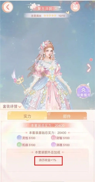 特定的套装还能增加游历收益呢!那究竟有哪些套装能提升游历加成呀?据了解,目前能提升加成的套装只有一套:复古洋装-洛里薇丝。这套衣服能在游历行装基础收益加成的前提下,再额外获得1%的收益加成。要是仙主大人给这套套装注灵或者升阶,额外收益的加成也会跟着不断提高哦!