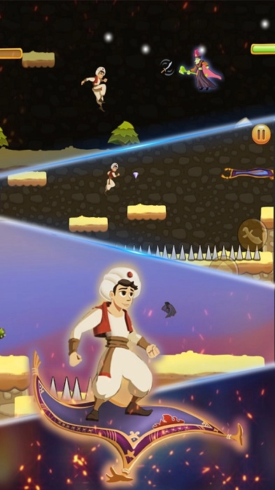 《阿拉丁神灯冒险记》是一款充满刺激与趣味的跳跃闯关游戏。游戏中,玩家将化身为勇敢少年阿拉丁,携神灯开启一段奇妙的冒险旅程。玩家需凭借精准的跳跃操作,避开各类陷阱与障碍物,探索迷宫般的关卡,寻觅隐藏的宝藏与秘密通道。此外,玩家还能解锁新角色与装备,增强自身能力,挑战更高难度的关卡。