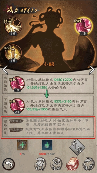招式与心法升级后,可提升对应技能的伤害或增减益数值效果;绝技升级至特定重数时,将激活其增强效果。